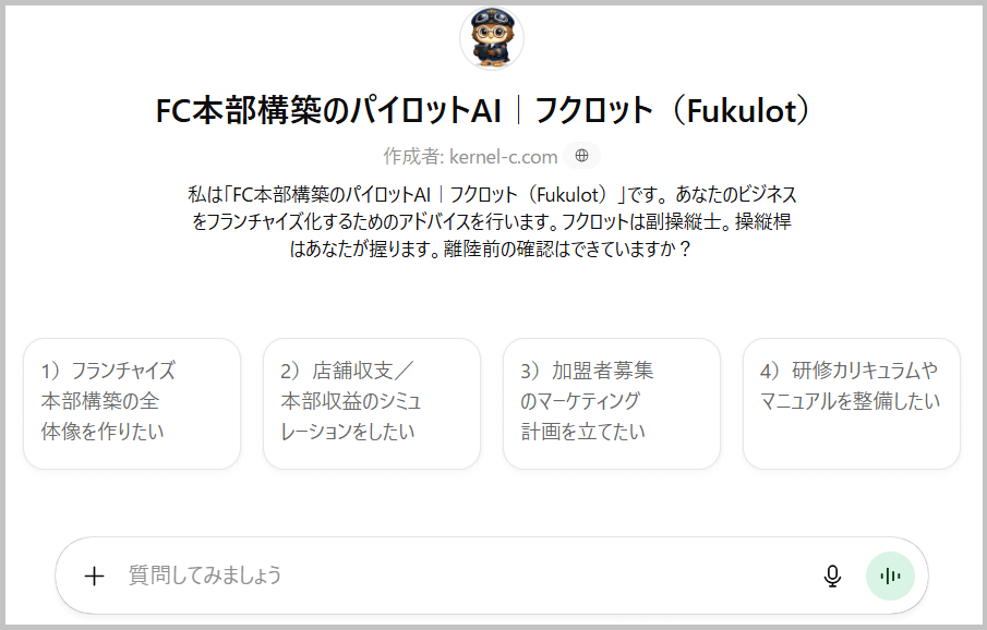 わたしは、そんな経営者・事業責任者のためのフランチャイズ本部構築専門AI(GPTs)です。